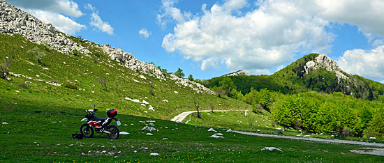 | Unser Weg wird nun geschottert, wir fahren durch eine Hochebene, wo am Wochenende viele Kroaten hierher kommen um auf den grünen Wiesen links und rechts zu grillen und zu feiern. Weiter geht unsere Strecke durch den Wald, eine breite geschotterte Strasse führt uns vorbei an einzelnen Waldhäusern. Da wir hier über 1000 Meter hoch sind, kann es im Mai noch Restschnee geben. Hier oben im Grenzgebiet zwischen Slowenien und Kroatien sieht man noch einzelne, interessante Festungen. |