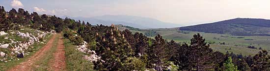 Weiter durchfahren wir ein Tal bis wir dann wieder links in eine geschotterte Serpentienstrecke einbiegen. Schnell kommen wir über 1000 Meter hoch, fahren einen kleinen Ringweg bis hoch zu einem Aussichtspunkt. Von dort gehts durch den Wald wieder Bergab. Ein kurzer Abstecher auf Teer bringt uns wieder auf eine geschotterte Strasse die uns nun durch eine Almlandschaft führt. Nach einem weiteren 5 Kilometer langen Teerstück kommen wir wieder an eine Schotterstrecke die uns rauf und runter bis zu einem kleinen Dorf ( 5 Häuser) bringt. Hier fragen wir einen Deutschsprachigen Einwohner, der auf einen Seitenweg zeigt und lächelt. Denn fahren wir dann auch, und jetzt wissen wir dann auch warum ! Eine superlandschaft tut sich vor uns auf. Wir fahren über eine Hochebene über Almen, vorbei an wildlaufenden Pferden, Kühen und Ziegen durch saftige Wiesen. Nach etlichen Kilometern der Augenweide erreichen wir eine geteerte Serpentienenstrasse die uns wieder zur Küste bringt wo unsere Route endet.