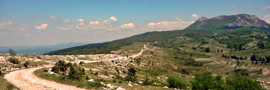 Unsere erste Route die wir in Kroatien in Angriff nehmen. Von der Küstenstrasse geht eine kleine geteerte Strasse in Richtung des Ucca - Gebirges, der wir folgen. An einzelnen Häusern am Hang vorbei schlängelt sich der Weg berauf. An einer Gabelung wird aus dem Sträßchen ein Schotterweg. Der breite und gut ausgebaute Schotterweg wird nun steiler (ca. 14 %) . Nach einigen Kilometern erreichen wir den ersten Bergkamm. Die Strecke windet sich durch die Hochebene. |