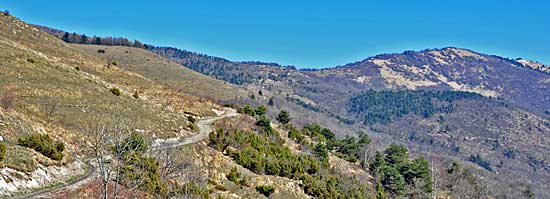 Die gute schottrige Strasse führt uns vorbei an einer Klosterkirche und weiter gehts den Berg hoch bis wir einen Gipfel mit Gipfelkreuz und einer kleinen Kapelle erreichen Dort am Gipelkreuz genießt man einen herrlichen Ausblick auf die umliegenden Berge. Nach einer Pause fahren wir den gleichen Weg ein Stück zurück und biegen dann nach rechts ab. Jetzt befahren wir eine geschotterte Strecke die sich am Berg entlangzieht bis wir eine kleine Ortschaft erreichen wo diese Route endet. |