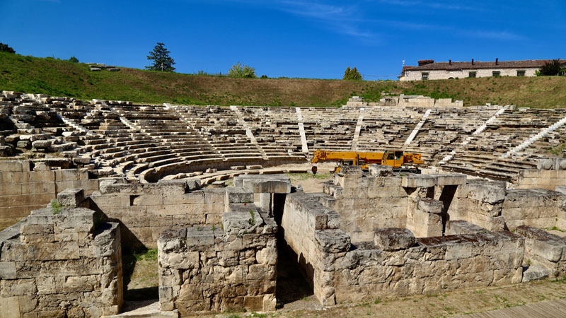 Gestern Abend waren wir noch am Strand in einem Lokal beim Essen, heute strahlt wieder die Sonne und wir kommen gegen 9 Uhr los. Verkehrsreich geht’s die ersten Kilometer parallel zum Strand entlang. Nach einem Café am Strand tauchen wir in die einsame Bergwelt ein. Eine kurvenreiche Teerstrasse bringt uns zu einem Hochplateau mit toller Aussicht auf das umliegende Gebiet. Es ist ein toller Bergpass wo wir ganz allein unterwegs sind. Dann geht’s sehr geradlinig und flott zur Stadt Larisa wo wir gut und mit viel Verkehr mitschwimmen bis zur Stadtmitte um das kleine Amphitheater zu besichtigen. Verkehrsreich geht’s dann wieder aus Larisa. Die Landstrasse ist geradlinig aber mit Verkehrsschilder von 70 KM/h Höchstgeschwindigkeit bestückt (Achtung: Radar). Irgendwann biegen wir links ab und das Motorradfeeling kehrt zurück. Wir streifen einen See wo man einige Vogelarten beobachten kann. Der nächste Abschnitt ist dann wieder Landstrasse wo der Verkehr immer mehr wird je näher man der Stadt Nea Ionia bzw. Volos kommt. Nach der Stadt kommt ein Stück Landstrasse, danach ein Stück Autobahn. Der letzte Abschnit bis zum Ort Glyfa wo wir am nächsten Tag auf die Insel Euböa übersetzen ist wieder einsam. Da wir heute noch etwas Zeit hatten haben wir noch das Meer genossen. Achtung: Am Streckenende im Ort Glyfa gibt es keinen Campingplatz, nur 44 km vor Streckenende (Camping Agios Ioani C558). Wer am Camping übernachtet sollte am nächsten Tag rechtzeitig losfahren um die Fähre zu erwischen). |