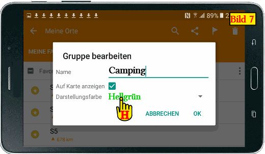 Es erscheint eine Favoritenliste mit den Stellplätzen. In OsmAnd werden alle Favoriten, die man nacheinander importiert in eine einzige Kategorie Favoriten gespeichert. Wir möchten aber die Stellplätze in einer anderen Kategorie und mit einem anderen Symbol als Camping oder Übernachtungsplätze speichern. Um nun die Favoritengruppe umzubenennen klicken wir auf das Menübutton (siehe E in Bild 6), es öffnet sich ein Eingabedialogfenster, dort kann man den Gruppennamen ändern, in unseren Fall wäre das Stellplätze (F), dann klicken wir auf Darstellungsfarbe, es erscheint eine Liste, wo man die Symbolfarbe auswählen kann,in unserem Fall wäre es Blau (siehe G in Bild 6). |