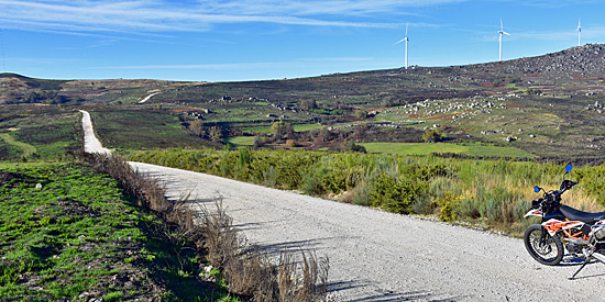 | Man folgt der breiten Piste, die in einem Windradpark hineinführt (max. Geschwindigkeit 30km/h). Man fährt am Hang und am Fuße der Windräder entlang. |