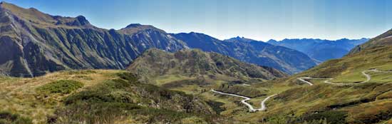 | Zu Beginn bringt uns eine kleine fast einspurige Strasse auf die erste Alm, dann beginnt der Schotter. Überall auf der Strecke laufen die Rinder frei umher, wer sich eine Pause gönnt kann das Glockenspiel genießen. Weiter zieht sich die tolle Strecke bis über 2000 Meter hoch, wo wir dann die Passhöhe erreichen. |