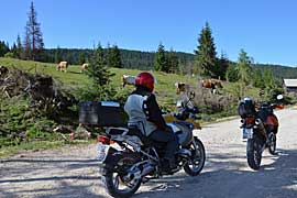 Die Strecke führt durch eine sehr bekannten Schlucht auf einen einspurigen Forstweg. Ca. in der Mitte der Schlucht kann man stoppen und den Flusslauf und Schlucht weiter erkunden. Ausser Forstarbeiter ist niemand unterwegs. Danach streifen wir tiefe Karstlöcher (in denen man hinab steigen kann), wunderschöne Hochebenen mit Streusiedlungen. Diese Route gehört zu den Top 10 in Rumänien. |
