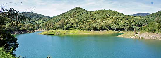 Nachdem wir das erste Schotterstück hinter uns gebracht haben, müssen wir ein paar Kilometer auf einer Teerstrasse fahren bis wir dann wieder auf eine Schotterstrasse einbiegen. Diese führt uns durch einen Wald mit einigen Aussiedlerhöfen. Mehrere Rudel Schweine laufen hier frei umher. Am Ende dieser Tour kommen wir noch an einem Stausee vorbei. |