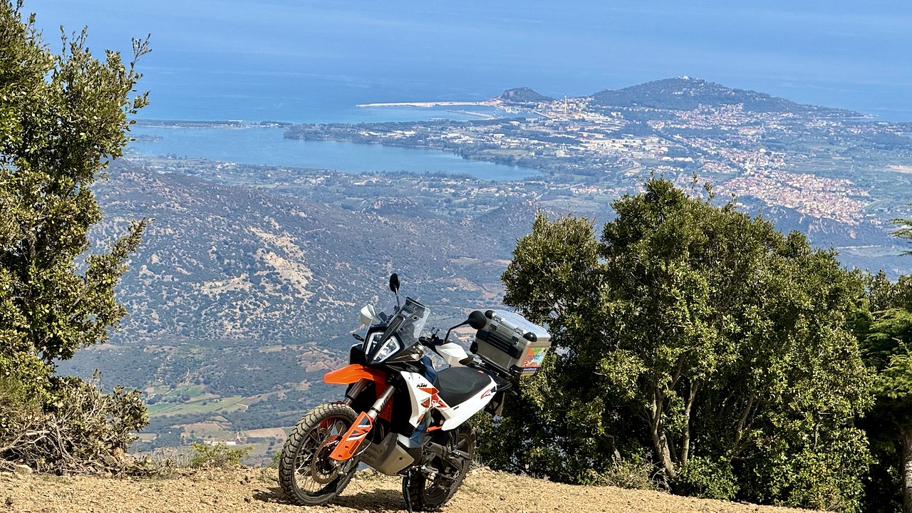 Die Fahrt durch das um die Mittagszeit ausgestorbende Dorf mit seinen kleinen engen und vielzähligen Gassen ist sehr zeitraubend. Nach dem Dorf beginnt nun die Schotterstrasse. Die ersten Kilometer gehen durch den Wald zu einer Lichtung wo man rechts den Berg hochfährt. Nun verschwindet der Wald und es erwartet uns ein grandioser Ausblick hinter ins Tal bis zum Meeresstrand der etwa 20 Kilometer Luftlinie entfernt ist. Es gibt ein kleines steiles Zwischenstück zu meistern, jedoch ist dort der Belag festgefahren. |