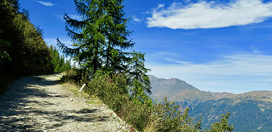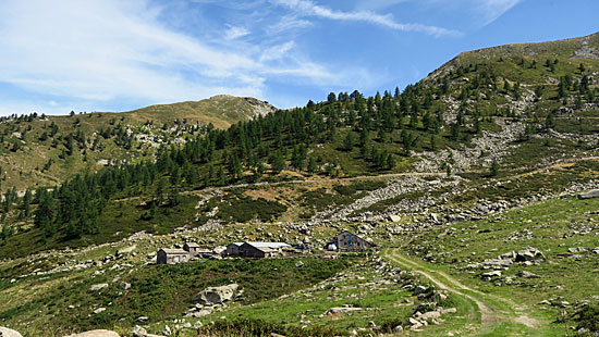 | Ab 1900 m Höhe hat man die Baumgrenze erreicht. Man sieht kahle mit satten Weiden und Alpenrosen (Blüte im Juni und Juli) bewachsenen Berghänge. |