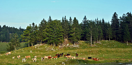 | Immer wieder laden Bänke, liebevoll platziert, ein zur Rast. Auf die Almen sieht man verstreut mehrere Almhütten, auch Bajte genannt. |