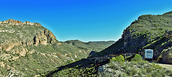 | Der Weg schlängelt sich am Hang, in den Mulden muss man mit einzelnen Kiefern rechnen, deren Baumkrone manchmal in der Fahrbahn reicht. Meistens kann man jedoch den Ästen ausweichen. Kurz danach verliert die Straße, den Charakter der Hangstraße, sie führt ins Innere der Steppenlandschaft hinein. Links sieht man ab und zu ein ausgetrocknetes Flussbett, das mit Staumauern befestigt ist. |
