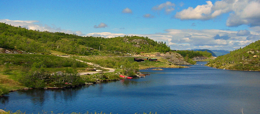 | Nach einiger Zeit geht's abseits der Hauptstrasse weiter auf kleinere Strassen. Idylische Landschaften durchfahren wir, kommen durch kleine Tunnel, vorbei an sogenannte Geröllhalden ( Steinerhaufen siehe Bild ). Letztendlich kommen wir an unsere erste kleine Fähre mit der wir den Lysebotnfjord überqueren. Weiter geht's zum Zeltplatz wo wir unser Quartier aufschlagen. Auch gibt es ganzin der Nähe s.g. Blockhütten zu mieten. |