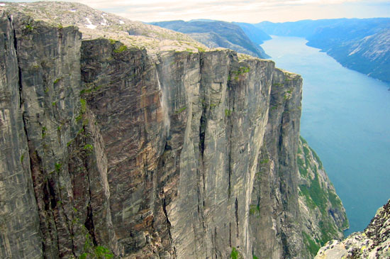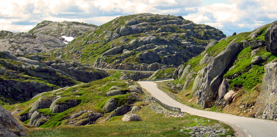 | Eine kleine Stichstrasse schlängelt sich meist sehr schmal die 31 Km zum Lysebotn Fjord . Bis Ende Juni liegt auf der bis zu 850 Meter hochgelegenen Strasse noch Schnee, jedoch sind die Strassen schon frei. Die Landschaft hier ist fahrtechnisch und Landschaftlich ein kleiner Leckerbissen. Überall sind kleine Steintürme zu sehen. Am Ende der Stichstrasse kann man mit der Fähre für 175 Kronen (ca. 23 Euro ) nach Foresand, Richtung Stavanger gelangen. Direkt in Lysebotn gibt es einen Campingplatz auf dem wir unser Nachquatier aufschlagen. Am nächsten Tag soll der Fels Kjerag in Angriff genommen werden. Der Fels Kjerag kann von Lysebotn aus bestiegen werden. Überall in den Prospekten wird dieser Fels abgebildet. Er hat einen Durchmesser von ca. 3 Meter und liegt ca. 1000 Meter über dem Meeresspiegel. Man fährt vom Zeltplatz die Serpentinenstrasse hoch zur 750 Meter hoch gelegenen Aussichtsplattform. |