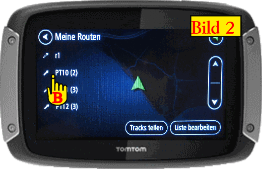 Es erscheint ein Fenster, wo alle importierten Routen aufgelistet sind, wir klicken auf die Route PT10 (siehe (B) in Bild 2). |