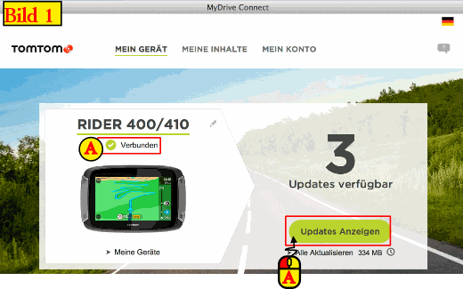Nach der Installation von MyDrive Connect schließen Sie Ihr TomTom Navigationsgerät über ein USB-Kabel an Ihren PC / Laptop, wo das MyDrive Connect in Windows oder Mac läuft. Es erscheint (Bild 1). Unter den Gerätenamen wird der Status (A) in Bild 1 der Verbindung angezeigt, dass ist die Voraussetzung um Routen/POI von der MDMOT-CD zu importieren. Bevor man jedoch die Routen/POI aufspielt muss man die verfügbaren Updates (A) durchführen. Das können aktualisierte Karten, Navigationssoftware, POI oder Blitzer sein. |