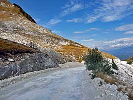 Ab jetzt geht eine geschotterte aber breite und gut zu fahrende Strecke in einen Kessel wo der Marmor abbgebaut wird. Direkt zwischen den Baufahrzeugen kann man hier bis ganz hinten fahren, wo dieser Marmor abgebaut wird. Das ist schon gigantisch wie groß die LKW oder Bagger in diesem Steinbruch sind, und wir "mittendrin". Nach einer Besichtigung fahren wir zurück, bis wir an einen Abzweig zu einem Rifugio kommen. |