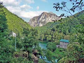 Hier fahren wir hoch, trinken einen Kaffee und geniesen die Aussicht. Wieder zurück an unserer Weggabelung fahren wir über bewaldete Hügellandschaft, typisch für die Toskana. Unsere Strecke schlängelt zu ein paar Bergdörfer hoch, durch Kastanienalleen. Wir kommen an einen schönen Stausee mit einem versunkenen Dorf vorbei, das man zu dieser Jahreszeit sehen kann, denn der See führt kaum Wasser. An einer größeren Ortschaft biegen wir in ein Seitental ein. Links und rechts Berge, die kleine Teerstrasse schlängelt sich durch diese Schlucht. |